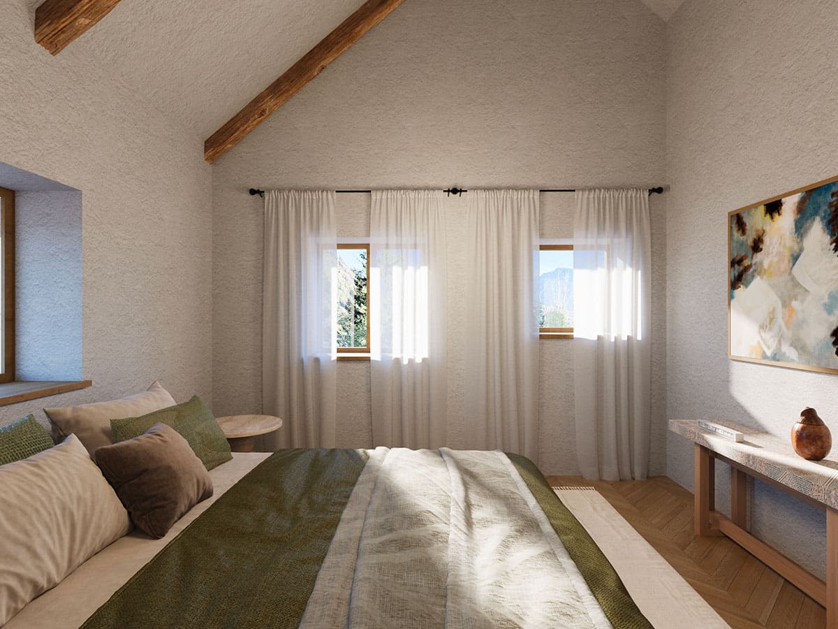 All’interno gli ambienti raccolti creano un’atmosfera calda e accogliente, con una zona giorno al piano terra comprensiva di cucina rustica e un salotto, dove il camino offre calore e conforto nelle serate più fresche, mentre al piano superiore si trovano le camere da letto.