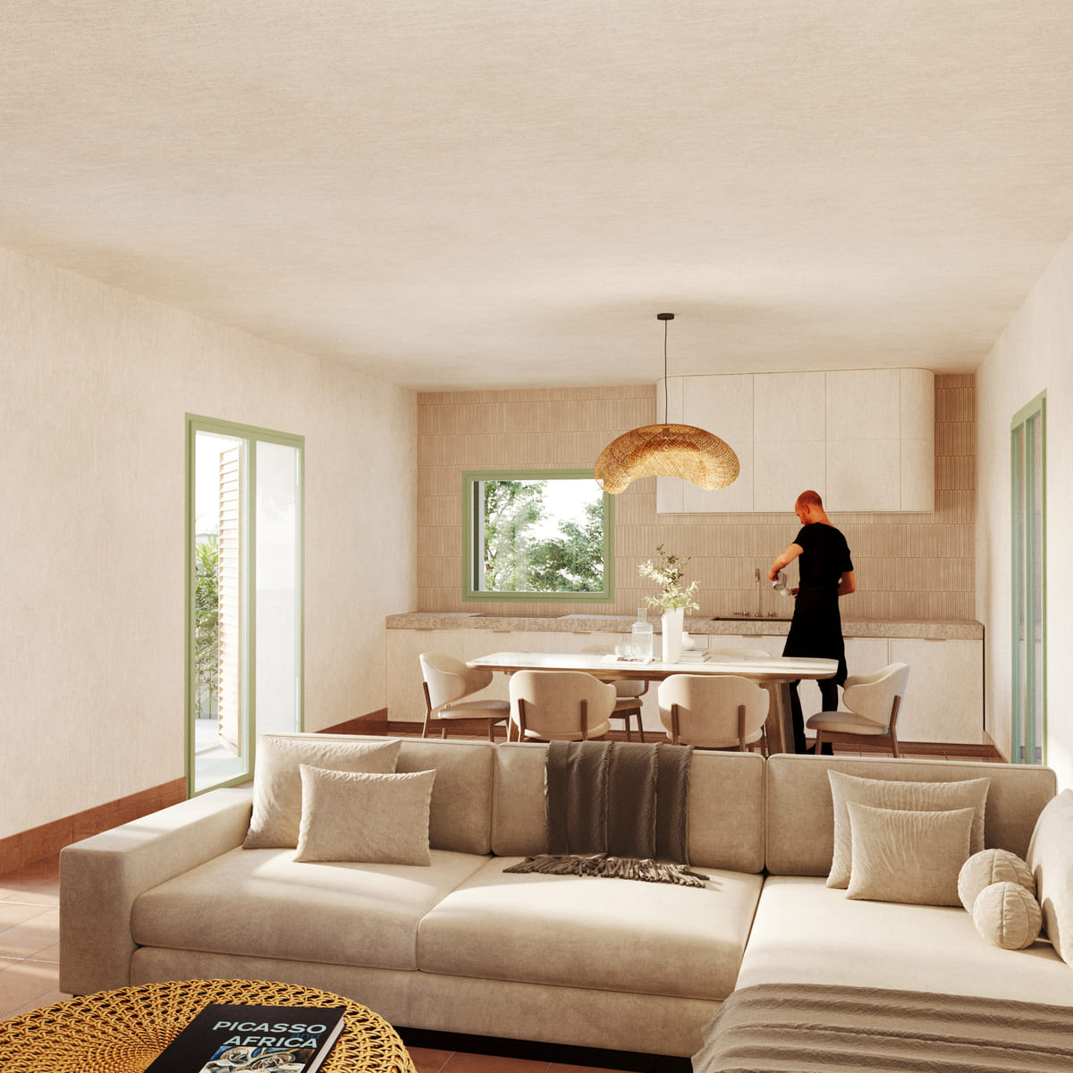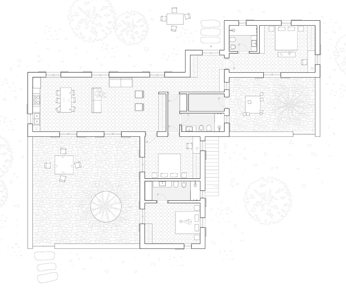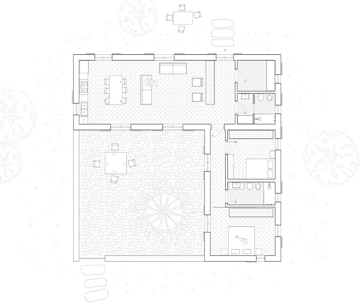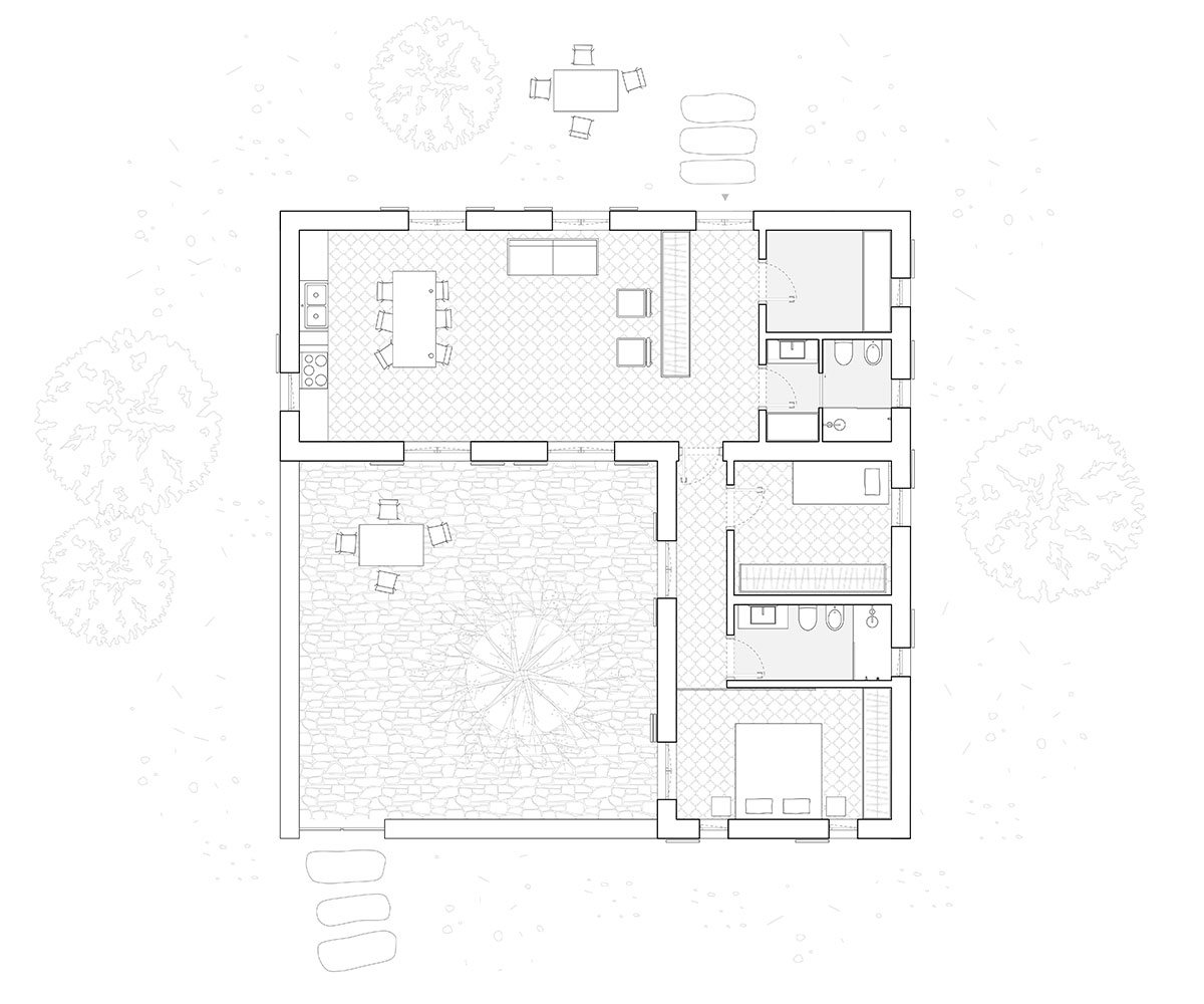 La disposizione dei volumi nello spazio è attentamente studiata per creare un patio, considerato il fulcro della vita domestica, dove si condivide cibo e momenti sociali.