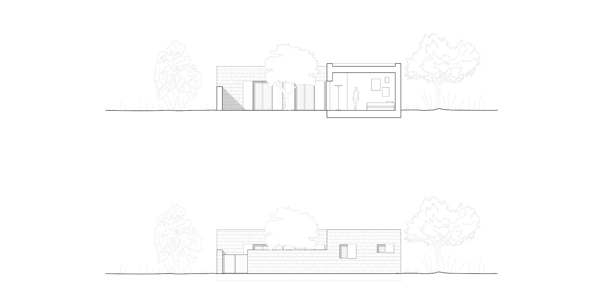 Il patio costituisce l’elemento centrale, attorno al quale i volumi si sviluppano in base alle diverse esigenze. Cercando di favorire la privacy della zona notte. Una scala esterna può essere collocata in punti diversi e portare sul tetto, che diventa una terrazza orientata verso gli scorci migliori che il contesto ha da offrire.